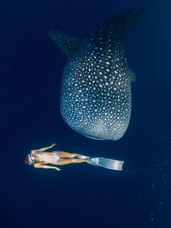 Young slim woman swims with Giant whale shark in blue ocean. Shark underwater and beautiful lady
