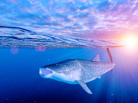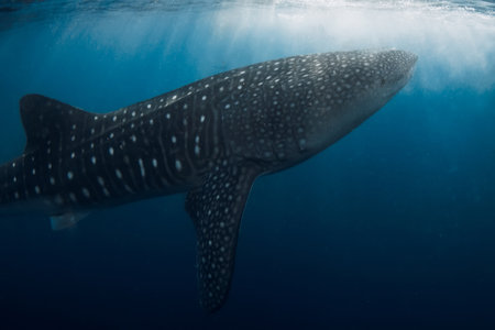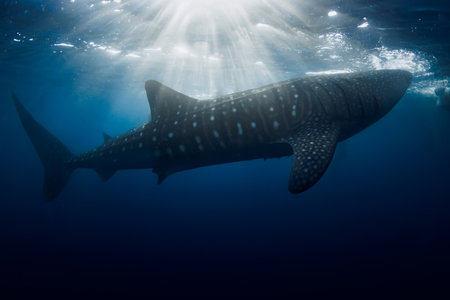 Whale shark swimming under sun rays in deep blue ocean