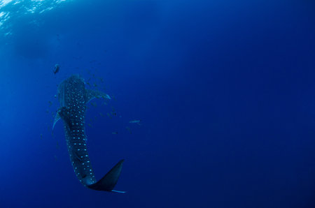 Whale shark in deep blue ocean. Giant fish swimming in open ocean.