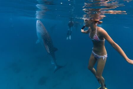 Young woman snorkeling with the Whale shark (Rhincodon typus) in the tropical sea. Oslob, Philippines