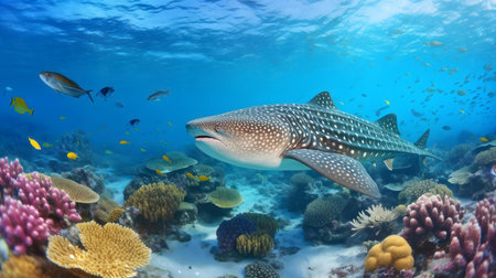 A whale shark swims gracefully through a vibrant coral reef, surrounded by colorful fish.