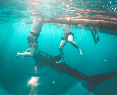 Whale shark (rhincodon typus) diving and close interaction in Oslob, Philippines.
