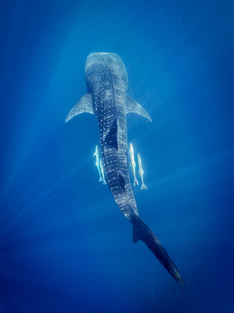 Whale shark swimming under sun rays in blue sea