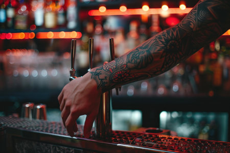 A bartender crafting a signature cocktail with flair, surrounded by a well-stocked bar and lively atmosphere.