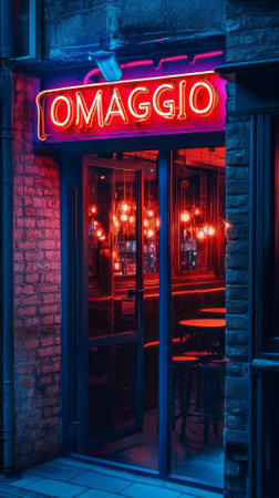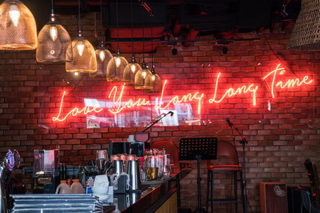 Beautiful interior of cafe wiith neon sign on wall, generative ai