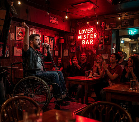A comedian in a wheelchair performs at an energetic comedy club, holding a microphone under the warm stage lights.