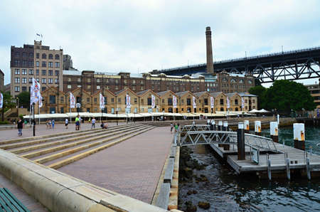 Modern cityscape with business office buildings and picturesque harbour at sunset. Darling Harbour, Sydney, Australia