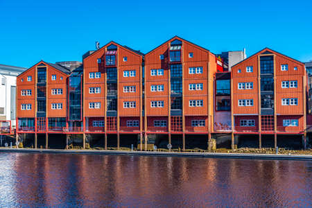 Colorful timber houses surrounding river Nidelva in the Brygge district of Trondheim, Norway