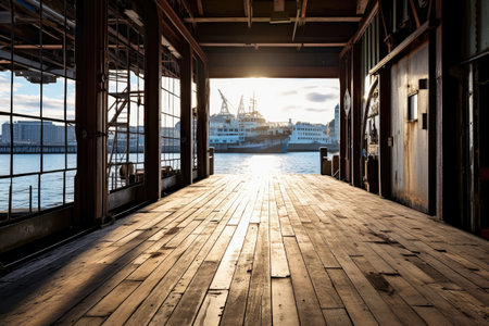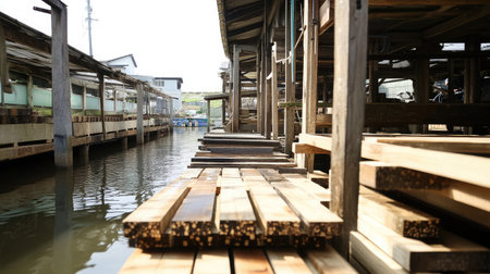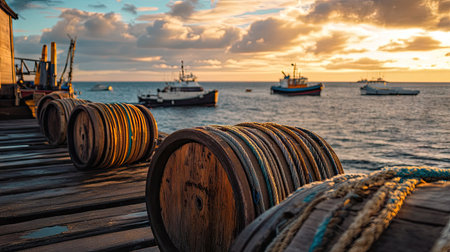 Charming fisher village boardwalk features weathered crates, vintage tones, and a serene atmosphere perfect for leisurely strolls