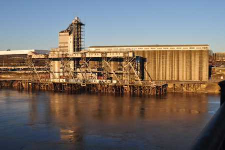 Old abandoned granary elevator and grain bin on the bank of a navigable river.