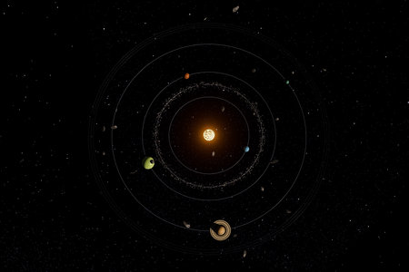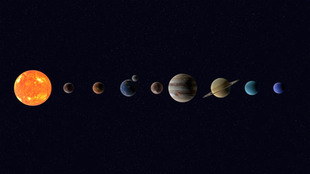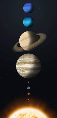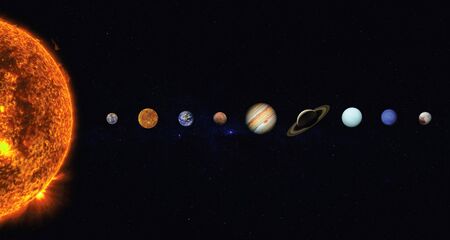 3D illustration of Solar system planets and objects. Sun, Mercury, Venus, planet Earth, Mars, Jupiter, Saturn, Uranus, Neptune
