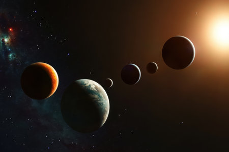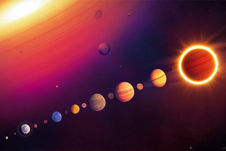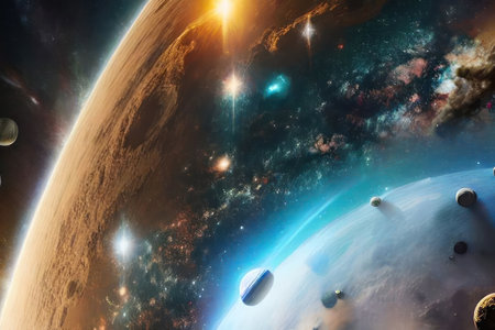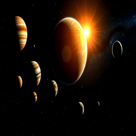 Vibrant celestial scene showcasing planets swirling around a luminous sun amid the vast darkness of interstellar space, evoking wonder and exploration