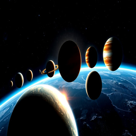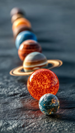 Vibrant planets aligned on a textured surface evoke cosmic serenity, blending science with artistry for educational or imaginative projects.