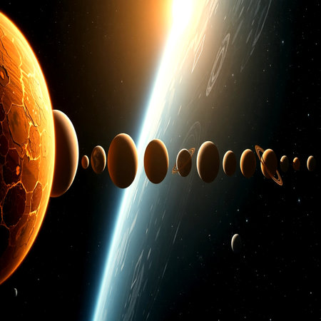 Vibrant cosmic scene illustrating planets gracefully orbiting a radiant sun amid a star-studded dark universe, blending artistic style with astronomic