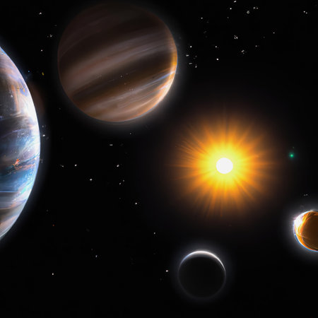 Bright celestial bodies navigate their orbits around a shining star in a cosmic dance filled with dust.