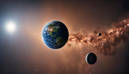 A stunning depiction of Earth and the Milky Way in the vast expansion of space. The planet Earth is in the foreground, while the Milky Way galaxy stretches across the background, showing its intricate details and swirling cosmic dust. The scene evokes a sense of wonder and wonder at the vastness and beauty of the universe.