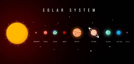 Vector creative illustration of planet of solar system on black background. Celestial objects in outer space. Astronomical bodies and sun in galaxy. Flat style cosmic design for education web, banner, poster
