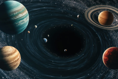 Planets of various colors and sizes orbit around a central black hole against a starry backdrop in space.