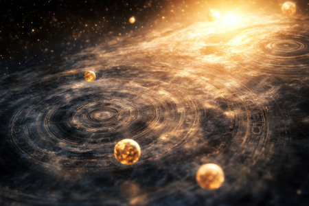 A swirling disk of cosmic material rotates around a distant star, with several planets visible in orbit.