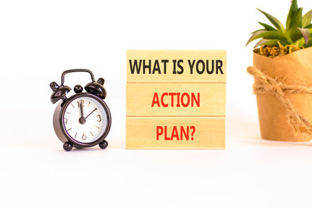 What is your action plan symbol. Concept words What is your action plan on beautiful blocks. Beautiful white background. Black alarm clock. Business what is your action plan concept. Copy space.