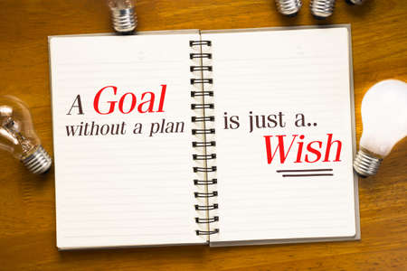 A Goal Without A Plan Is Just A Wish quotation in spiral notebook with light bulbs