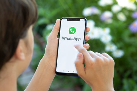 Palo Alto / USA - August 08 2019: Female hand with Apple phone with logo of social media WhatsApp on the screen. Social media icon. Can be used as illustration for news media or marketing concept