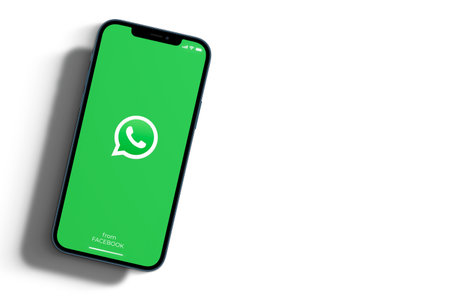 WhatsApp app on smartphone screen with large shadow marked giving the feeling that you are taller on white background. Rio de Janeiro, RJ, Brazil. September 2021.