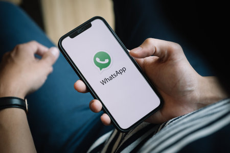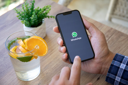 Chiang Mai, Thailand - March 31 2023: A female in casual clothes using her WhatsApp application on her smartphone. iPhone with WhatsApp logo on screen.