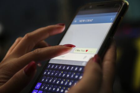 Hand typing question I LOVE YOU, message on black smartphone screen.