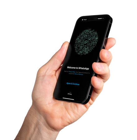 Alanya, Turkey - July 25, 2022: Man hand holding iPhone 13 Pro Graphite with social networking service messenger WhatsApp on the screen.