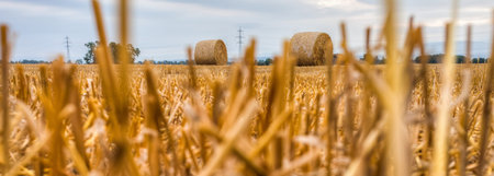 Stacks of hay in summer in yellow field with copyspace. Close up front view