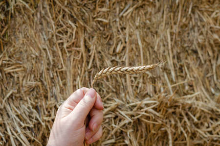 The hand of a mature woman holding a spike against a bale of dry straw. Close-up of a hand holding an ear of wheat.