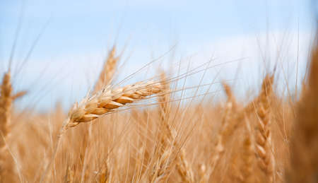 A wheat field on blue sky. Dry grain harvest before harvest. Agriculture. Fit and quality. backdrop of ripening ears of yellow wheat field. Copy space on horizon in rural meadow. Close up nature rich.