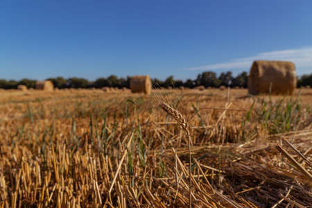 spikelet of wheat on a background of an agricultural field with bales of straw
