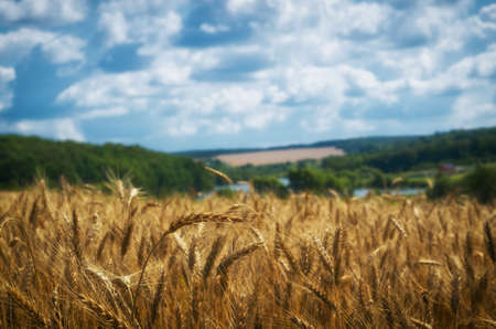 Close up of ripe wheat ears against beautiful sky with clouds. Selective focus.