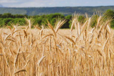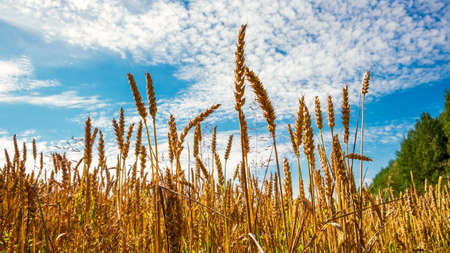 Golden wheat spikelets on field ripe crop before harvesting on summer day on blue sky background