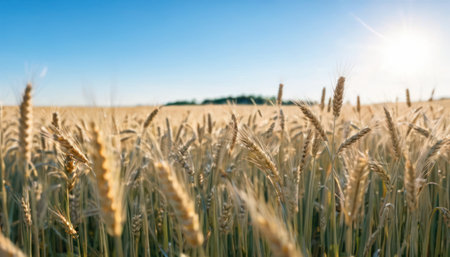A close-up view of a vast golden wheat field under a clear blue sky. The sun's warm light illuminates the ripe wheat stalks, creating a rich, golden hue. The field stretches towards a distant horizon, suggesting abundance and the bounty of nature. The evokes a sense of peace, serenity, and the beauty of agricultural landscapes.