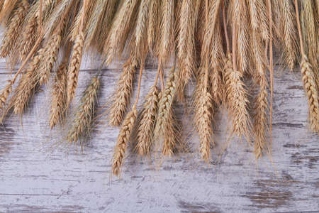 white wooden background in retro, vintage style. on it are cut ears of wheat. copy the space. tex