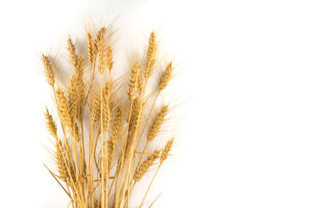 Ripe wheat ears on a white background. Autumn harvest concept, place for text.