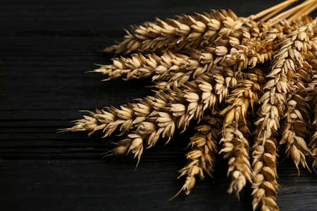 spikelets of dry wheat in a bunch on a black wooden table, wheat place for text