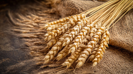 Stalks of ripe wheat, barley, and rye bundled together on a rustic background, symbolizing abundance and a healthy harvest