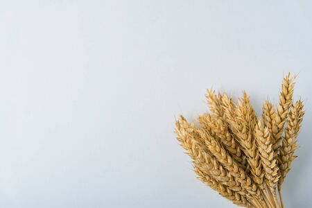 Spikelets of wheat on a blue background. Simple flat lay with copy space. Stock photo.