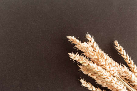 Bunch of wheat ears on rich black background. Agriculture concept in minimalist style. Copy space for the text
