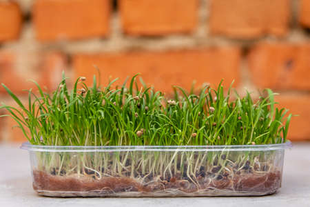 Micro green from mustard. Home plant cultivation, gardening. Microgreen eco nutrition. Beautiful green microgreen leaves. Germination of microgreen seeds at home. Vegan, healthy eating and health food