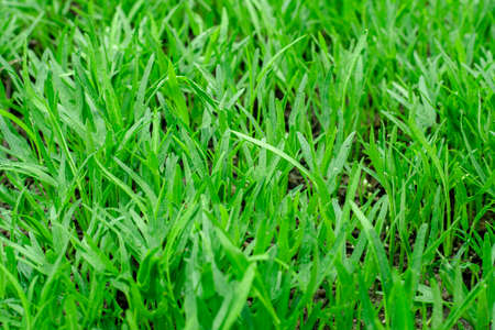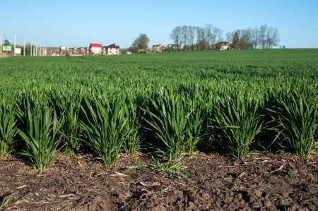 photographed close up young grass plants green wheat growing in the field of agriculture, Agriculture