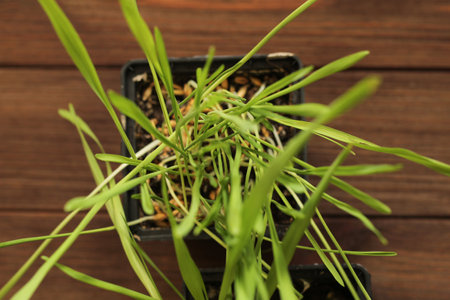 Growing microgreens in container at home. Gardener planting young seedlings of parsley in vegetable garden or laboratory. home gardening. Growing healthy food concept. wheat
