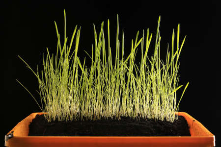 close-up of a beautiful young green grass on black background studio