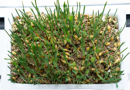 Germinating a lot of wheat seeds with green sprouts