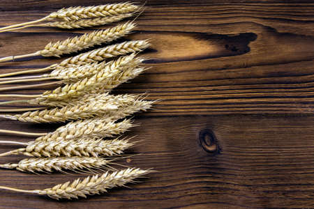 Ears of wheat on a dark wooden background.