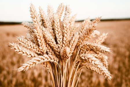 Experience the essence of summer with a close-up of golden wheat ears against a backdrop of a vast wheat field, symbolizing the bountiful harvesting period